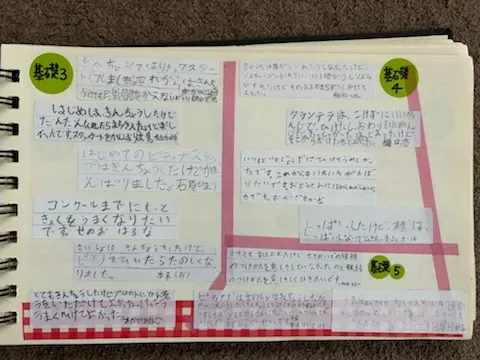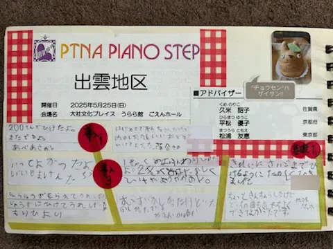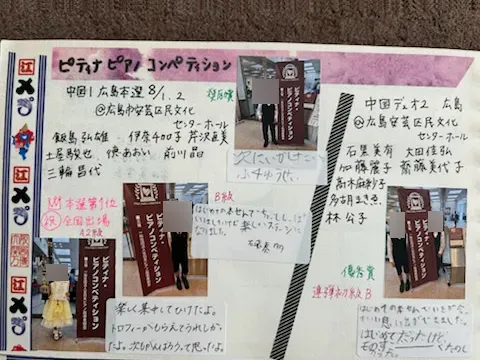 こうしてコンクールやステップに参加した生徒さんには、毎回感想を書いてもらい、写真とともにレッスン室や発表会で掲示しています。レッスン時間の前後では本番にチャレンジする生徒さんのミニ発表会を開催するなど、自分の世界だけに閉じないよう、自分以外の人の演奏/音楽活動との接点を作るように意識しています。